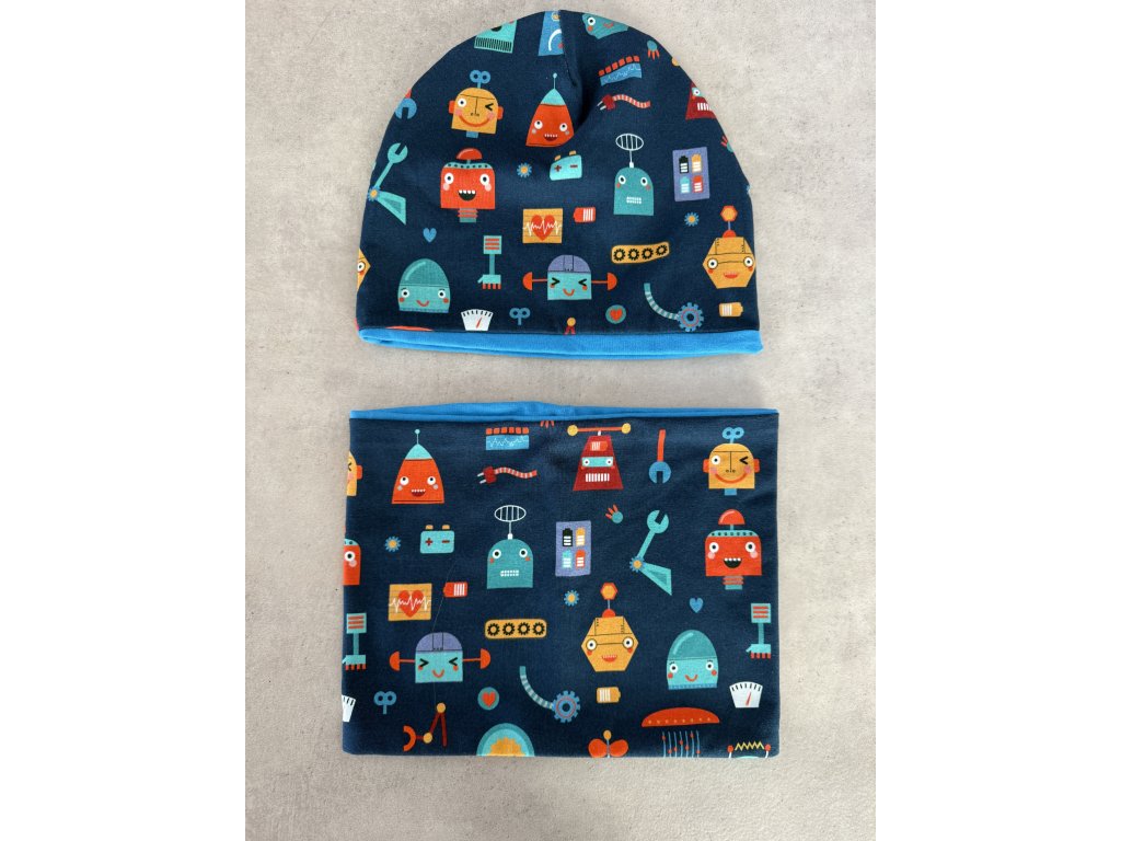 Jarní čepice a nákrčník jsou ušité z designového úpletu s motivem robotů.